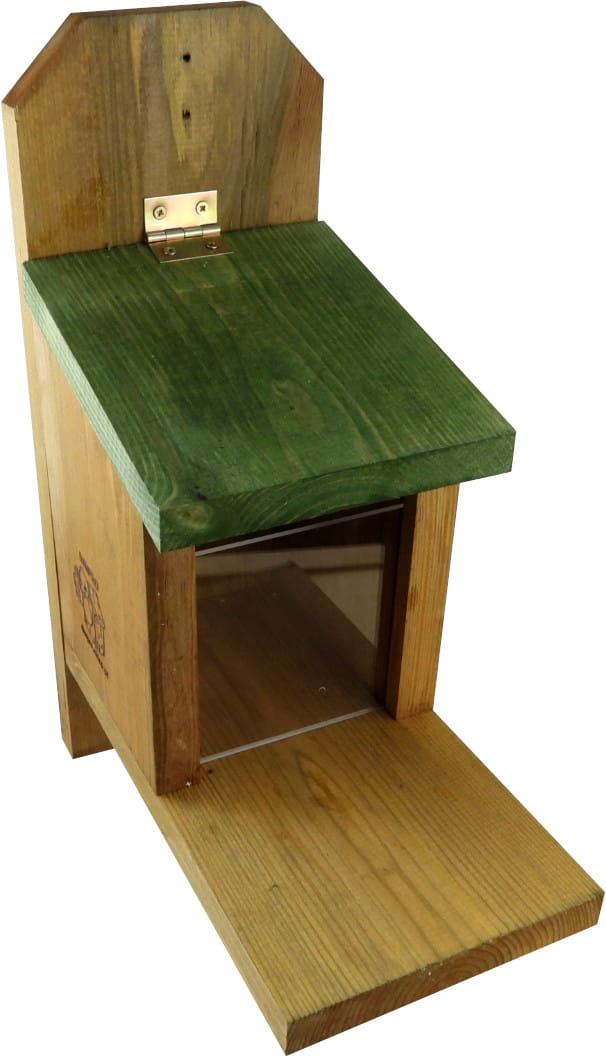 Pokrywa uchylna umożliwia łatwe uzupełnianie orzechów, kukurydzy czy nasion. Przezroczysta szybka chroni pokarm i pozwala kontrolować jego poziom.